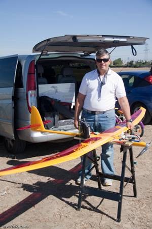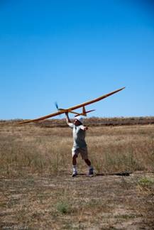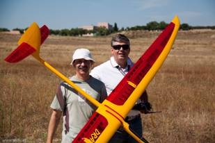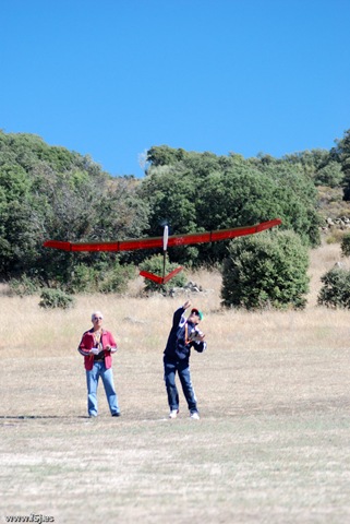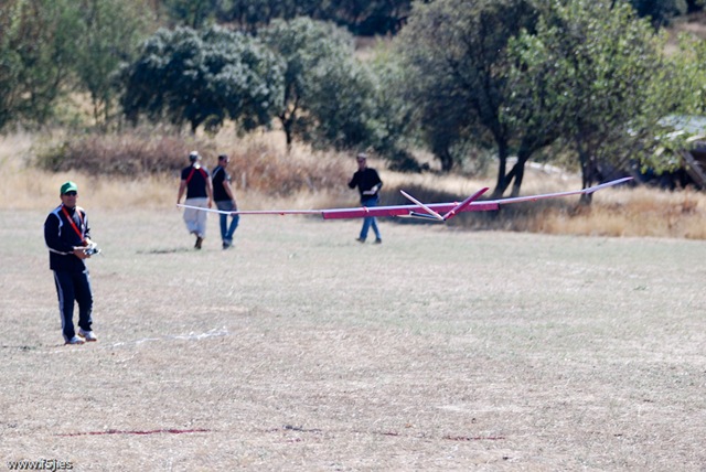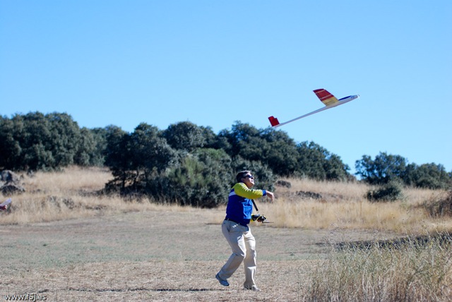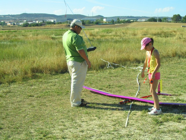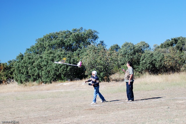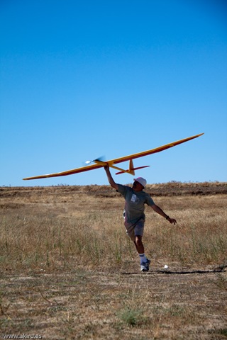 Con estas preocupaciones la dosis de canguelo aumentó a casi sobre-dosis, pero tuve la suerte de que Juan Ramos se acercó a ver el modelo y se ofreció para lanzarlo al aire, ya que Javier estaba con las fotos. Fue Juan el que me dijo que no me preocupara demasiado porque la flecha que presenta el ala suele pedir un centro de gravedad más atrasado.
