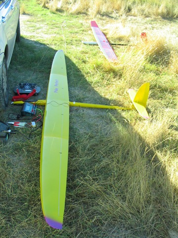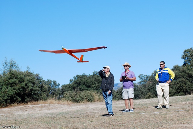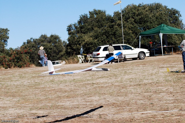Aunque algunos veleristas recomiendan hacer una prueba de planeo antes de lanzarlo al aire, de común acuerdo desistimos de hacer la prueba, ya que el velero pesa demasiado y si no le imprimes fuerza suficiente al lanzamiento lo puedes romper. Por cierto, el peso, midiéndolo antes de salir nos daba 2.200 gr. con la configuración mencionada más arriba y el dichoso plomo de centrado, bastante lejos del 1,7-1,8 de los Pulsar, las cosas como son. Y el consumo 52 Amp, excesivo para concurso pero ahora se trataba de ponerlo en vuelo con las máximas garantías posibles.