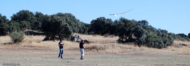 Pero una vez estabilizado el velero es verdaderamente majestuoso y a pesar de las fotos es difícil transmitir las sensaciones de ver volar de esa manera tantas horas de trabajo, incluso piensas que el velero vale lo que cuesta. Juan me recomendó comprobar el centro de gravedad con la prueba del picado a 45º y a pesar de que iba retrasado de cg, el ‘Dragon’ recupera la trayectoria con bastante normalidad. Apliqué ‘butterfly” y es como si metiera frenos, pero sin el más mínimo cabeceo: asombroso. Tras varias pasadas en las que nos dimos cuenta de que incluso silba, encaré al viento dominante -suave e ideal para un estreno- y le dí a los frenos, la sensación era que se quedó parado en el aire, pero ni venía ni caía, así que di otro giro amplio para perder más altura, volví a aplicar el butterfly y lentamente comenzó la bajada en plan ascensor, momento de especial disfrute para un novato en veleros de esta envergadura como yo, que hasta ese preciso instante no sabía lo que era volar un velero de 3,5m.; hizo un planeo señorial, acercándose poco a poco (ahora a corta distancia caes en la cuenta de las dimensiones del bicho) hasta posarse suavemente sobre el pastizal. ¡¡¡Buffffff!!! que gozada y ¿que me pasa en las rodillas que me tiemblan como flanes?…