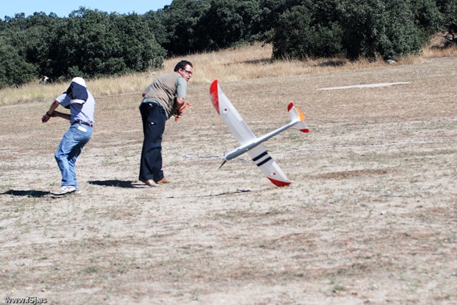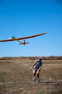 Comprobado el centrado de las superficies de mando y hecha la prueba de alcance de la radio ya no quedaban más excusas. Juan se ofreció a lanzarlo, y con su pericia acostumbrada y gracias a las fotos de Javier, os puedo decir que la experiencia es de auténtico subidón: cuando ves ascender el velerazo como si fuera por raíles, mucho más tranquilo y estable de lo que hubieras imaginado. Cuando llegó a una altura segura corté motor, aquí tuve que trimar profundidad porque buscaba el suelo y a los dos giros tuve que corregir alerones, como consecuencia del reviramiento de la balsa de las superficies móviles de una de las semialas (las limitaciones de la calidad de los materiales).