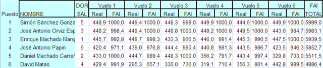 El concurso propiamente dicho, esta vez con solo seis participantes, Luis no nos pudo acompañar por enfermedad, otros no sabemos los motivos, estuvo muy disputado desde el principio, manteniéndose un mano a mano entre Simón y un servidor, con no pocos vuelos rozando la perfección, que solo se resolvió en el sexto y último de los vuelos, en el que, mientras Simón hacía un vuelo prácticamente perfecto, solo 13 centésimas le faltaron para los 7 minutos, yo hacía mi peor registro del día, fallando por tres segundos y además en el aterrizaje. Esto convertía a Simón en justísimo vencedor de la prueba, y de paso también de la Liga del año, a falta de una prueba, ya que su peor registro, el de la segunda prueba, supera en 7 centésimas de punto el mío de ayer, con lo que ni siquiera un mil en la prueba que falta me bastaría para poder arrebatarle esa posición, y ningún otro participante puede tampoco conseguir una puntuación final superior a los 2.997,42 puntos. Os recuerdo que el peor resultado de los cuatro concursos de cada participante se descarta.