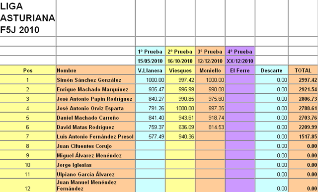 Os adjunto la hoja de resultados del concurso de ayer, tercero de la Liga F5J 2010, así como la correspondiente a la marcha de la liga.