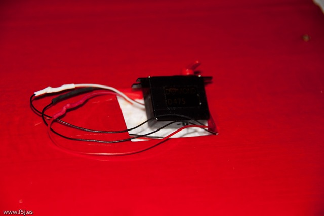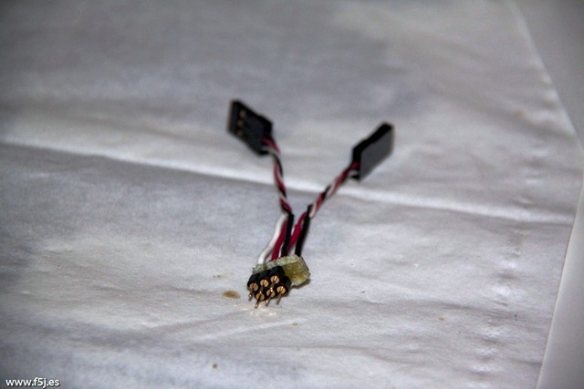 Los servos D47S (fast) sin el conector y empleando cable de 0.05 para ahorrar en peso. Juan Ramos y Jesús Dávila me pasaron ese cable. Los conectores hechos con zócalo de pines y plaquita de circuito integrado.