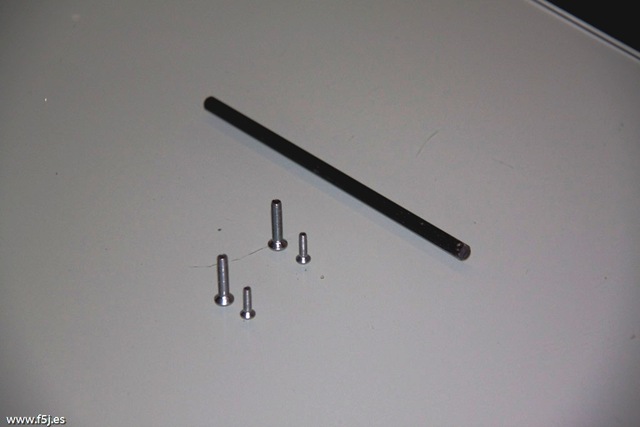 Bayoneta y tornillos. Deberían ponerse de nylon por las roturas pero estos son los que vienen en la bolsita. Pegamos el elevador y el pequeño pasador que sujetará el timón.