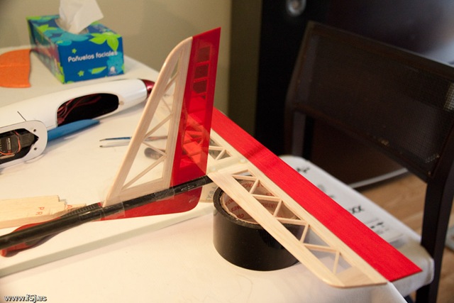 Pegamos y sujetamos el timón. Hacemos las salidas de las transmisiones sin debilitar demasiado la caña.