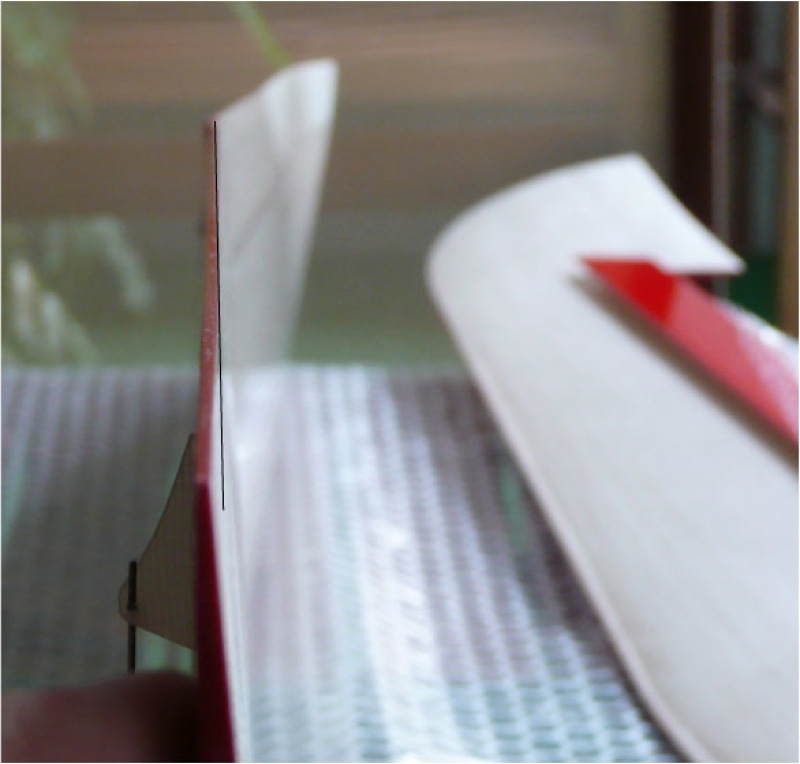 Esto lo imprimo en papel adhesivo y lo pego sobre una lámina de 0,3mm de plasticard, lo recorto y lo pego en el morro, alineando la parte gruesa a la derecha y la estrecha a la izquierda, el resultado es este: