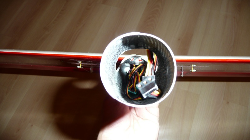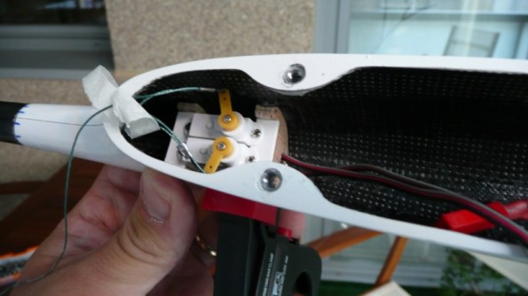 Una vez secado, se coloca las tapas (yo las he pegado con celo) y se monta el horn y la correspondiente varilla de mando cortada a la longitud adecuada. Estas piezas las facilita el fabricante.