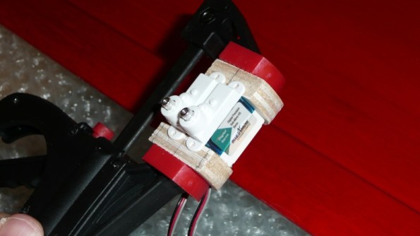 Una vez que el hilo está sujeto, pero aún no tensado, procedemos a pegar la bancada de los servos al pod, procurando hacer presión a los laterales del mismo. Esto ayuda a llevar a su sitio a los tornillos que sujetan las alas y que por defecto están muy separados: