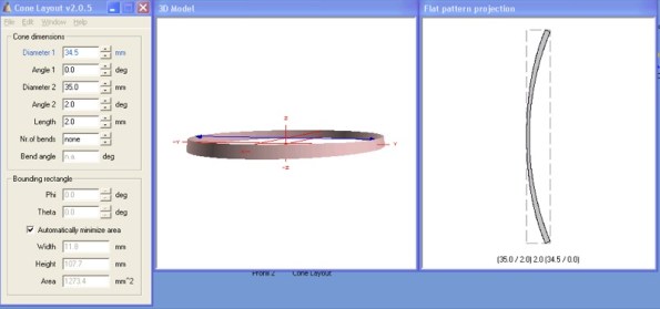 Y ahora viene lo divertido. Probablemente os parezca la solución más rebuscada, a ver si me sé explicar: no tenía muy claro cómo dar el ángulo de incidencia a la bancada del motor por lo que tras mucho pensar, aproveché que tenía instalado un programa en el ordenador llamado «Cone Layout» que sirve para dibujar conos en plano, para dibujar un cono de 35mm de radio en la parte superior (el tamaño de la bancada) y 36mm en la parte inferior, inclinada los dos grados de incidencia que se necesita; Una imagen vale más que mil palabras: