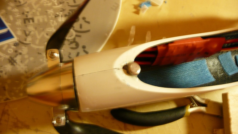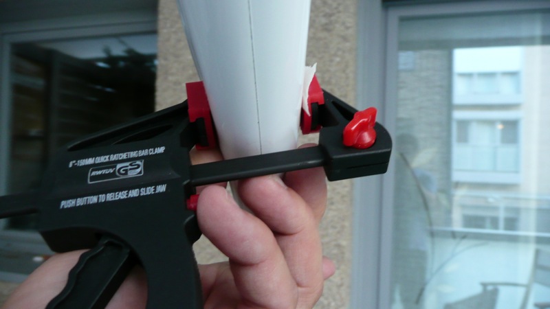 Alineado y pegado del pod a la cola con epoxy. Es bastante pesado hasta que consigues dejarlo lo más perfecto posible. Recomiendo hacerlo en una mesa grande y lisa. No hagáis como yo con una mesa de jardín…