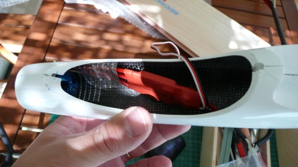 Respecto al motor, en 2s no tiene potencia para hacer una trepada importante. En principio volé con una hélice 10×6 pero le costaba moverla y pasé a una 9×6 que mejoró bastante el rendimiento y la trepada, aunque si quisiera competir tendría que pasarme a una 3S para poder hacer una trepada importante. Eso aumentaría el peso total en 25g (la batería 3S pesa 75g) con lo que no creo que el comportamiento se viese afectado.