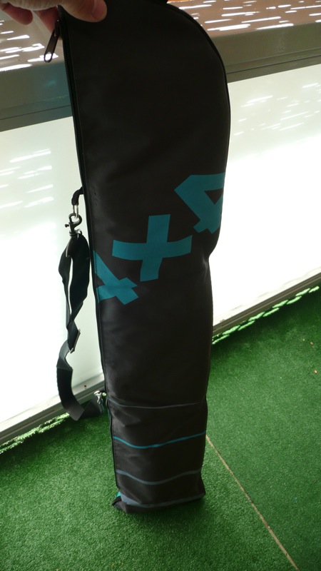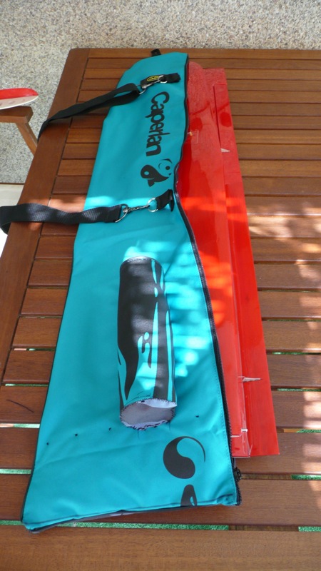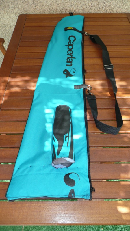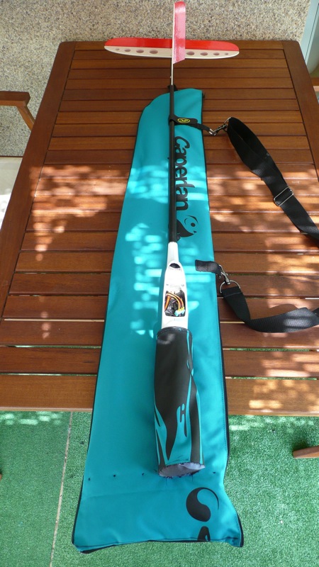 Está hecha con una funda de caña de pescar de Decathlon que tiene un precio de casi 7 Euros. Originalmente era más larga por lo que la tuve que recortar y coser a la medida de las alas y con el sobrante hice el bolsillo cilíndrico para el pod. Luego en la parte de arriba le he cosido un velero para sujetar la caña y he mejorado la cincha para colgar la hombro. Aunque no se ve, por dentro he puesto un poco de acolchado en la parte inferior y superior.
