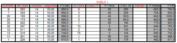 A que es debido tanta diferencia, casi nada tiene una única razón de ser, en F5J/Altímetro, intervienen todos los factores ya comentados de las anteriores F5J, pero acrecentados con la estrategia de cada piloto a la hora de afrontar el vuelo… ¿estrategia?, bueno podríamos llamarlo como mejor nos pareciera, a lo que me refiero es que el piloto decide antes o durante la subida, la altura a la que comenzar su velo a vela. Hemos visto vuelos en el que la mayoría ha aterrizado a los 10 minutos, pero cuando han salido las puntuaciones… menudas diferencias. En el primer vuelo del Fly-Off del pasado C. de España, siete de los diez pilotos superaron los 14’ 42”, sin embargo, las diferencias entre ellos llegaron a los 250 puntos y nos preguntaremos… ¿Cómo es posible, menos de 17” posibles de diferencia y tanta diferencia?… pues sí, porque aparte de las diferencias en la toma estaba la mas importante, la de la altura de partida. Dos concursantes hacen 14’ 55” (sobre 15) y los dos aterrizan a menos de 1 metro del centro, lógicamente pensaríamos que ambos tienen los mismos puntos … pues no, no solo no han conseguido los 1000 puntos FAI ninguno, sino que uno puntuó 998,2 y el otro 923,5, casi 75 puntos de diferencia. El ganador de los 1000 puntos voló 14’ 58” y se quedó a menos de 2m del centro. ¿Posible?, si, el ganador de la manga partió de una altura de 199m los otros dos concursantes 201 y 222m respectivamente. Otro concursante, en la misma manga, con un vuelo de 14’ 49” y toma a menos de tres metros, consiguió 998,8 puntos… su altura de partida era 173m, menos tiempo, mas separado del centro, pero menos altura de partida… ¿táctica?, ¿vista?, ¿manos?, ¿buena/mala suerte?, ¿equivocación? … yo creo que la suma de todos, pero cada uno puede interpretar estos vuelos por él mismo.