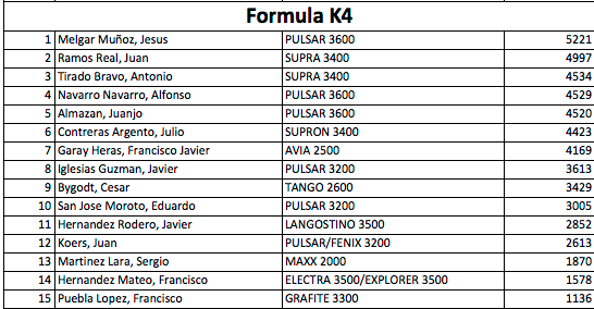 En K4, Juanjo Almazán tuvo una colisión en vuelo en la primera manga, que no le impidió hacer todos sus vuelos, Francisco Hernández tuvo problemas con su Electra en la primera serie de tres vuelos, lo que arruinó su concurso, en los tres últimos vuelos con su Xplorer no pudo recuperar. Francisco Puebla fue el peor parado, inexplicablemente perdió de vista su modelo, que se estrelló sufriendo daños muy severos. Alfonso Navarro y Francisco Garay obtuvieron 1000 puntos en las mangas 5ª y 6ª, respectivamente, las únicas que no ganaron Jesús Melgar y Juan Ramos.