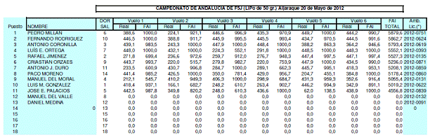 Al final, Pedro Millán (Club Radiocontrol Sevilla) con 5879,6 se hizo con el Campeonato de Andalucía 2012 de esta apasionante modalidad de F5J, la de las pilas de 50gr de peso máximo para los seis vuelos (sin posibilidad de recarga entre vuelos). Fernando Rodríguez (Club Radiocontrol Sevilla) con 5862,7 fue el Subcampeón y Antonio Coronilla (Club Radiocontrol Sevilla) con 5793,4 tercer clasificado.