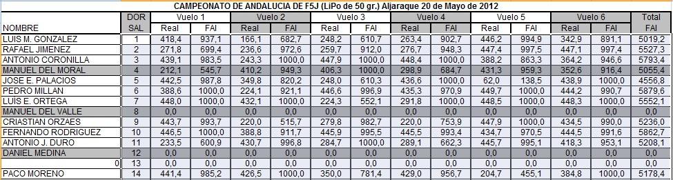 Clasificación General del Campeonato de Andalucía de F5J-50gr 2012