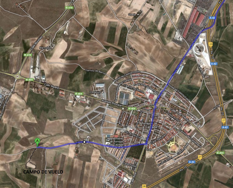 Teneis que tomar las salida de Parla Sur/Torrejón de la Calzada, continuar recto sin desviaros hasta entrar en el pueblo ( lo primero que vereís es el Desguaze de la Torre) pasar cuatro rotondas, en la quinta que como referencia tiene una fuente ( es la segunda rotonda con fuente) salir por la derecha (1ª salida) y continuar sin desviarse hasta salir del pueblo a un carril, continuar todo recto por el carril hasta que veais el campo de vuelo a vuestra izquierda.