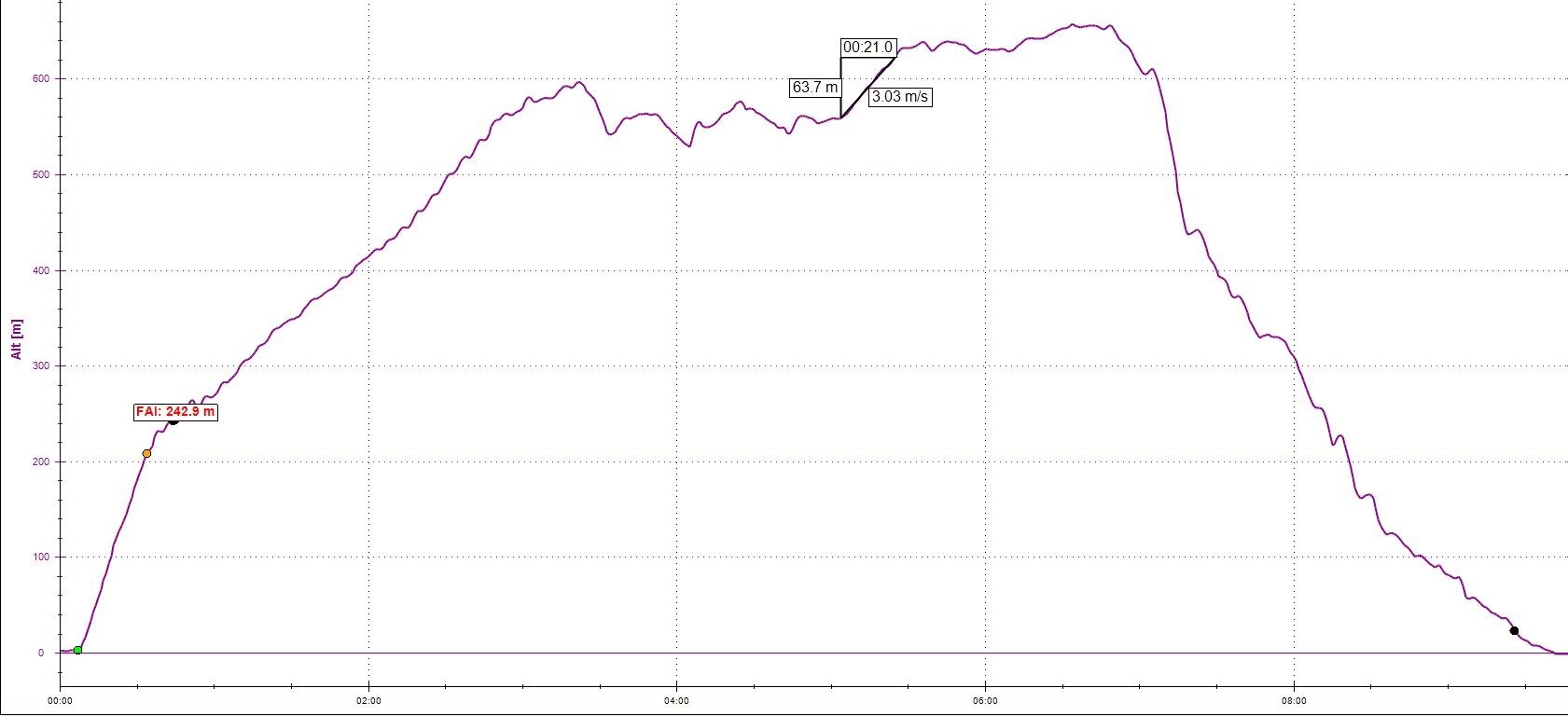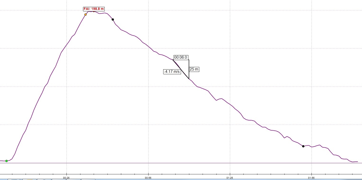 5) Las descendencias eran mucho más fuertes. En algunos casos, los logs mostraron descendencias de más de 4 m/s. En la sexta manga se veía los aviones cayendo como piedras. La imagen demuestra como Pedro Perez, el mismo que llegó a la estratosfera antes, cae a una velocidad vertiginosa para hacer un vuelo de tan solo 2’06”.