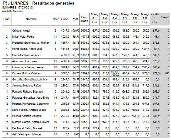Con las pilas cargadas, o mejor dicho… el estomago lleno, se reanudan los vuelos. La Dirección del Concurso ha ido publicando los resultados de los vuelos según se han ido terminado y el que ha querido ha podido seguirlo al minuto, Pedrito lleva trescientos puntos de ventaja al siguiente clasificado, que se lo disputan Ángel y Richard … se apuntaba la clasificación si no había sorpresas.
