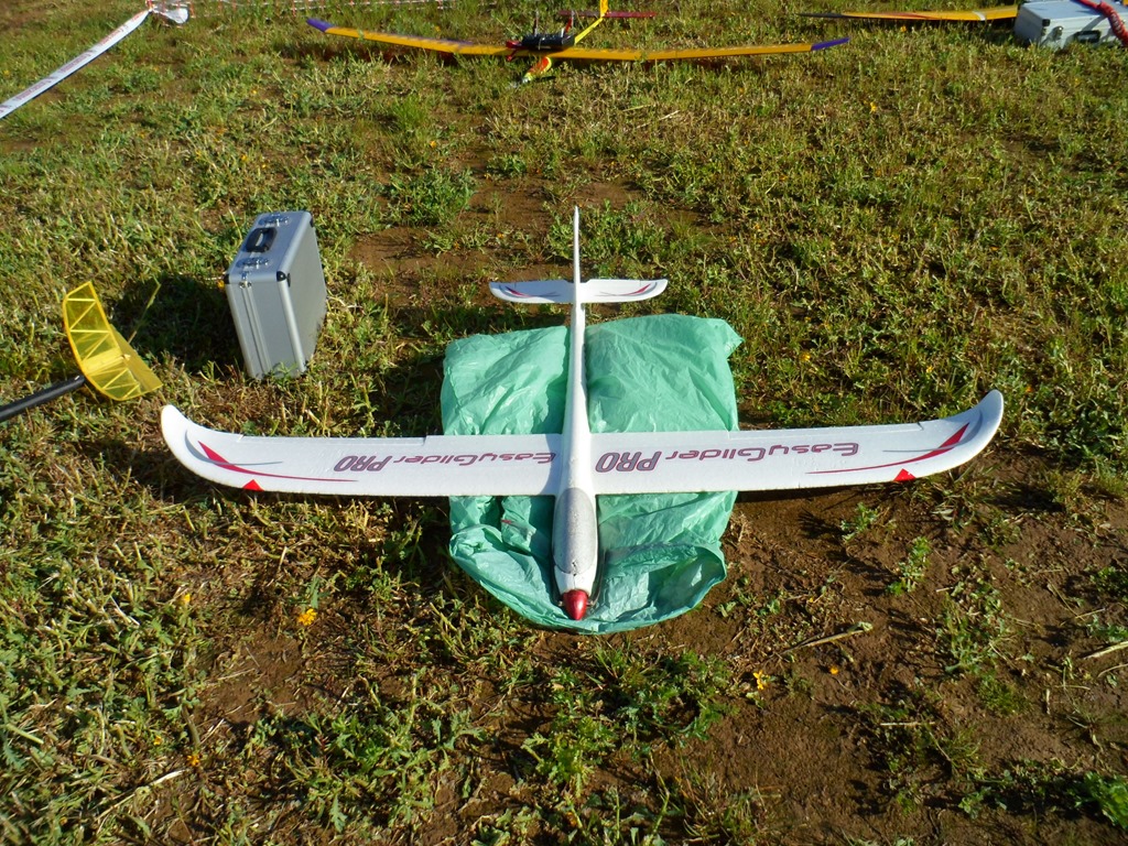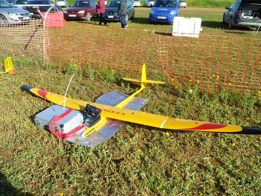 Pero … hasta el final, todos los vuelos son del concurso. En el primer grupo del quinto vuelo se enfrentan Pedrito y Ángel, sin quitarle méritos al resto de componentes, Jesús, José Enrique, Saturnino, Eduardo Famada, Javi y Pereira, pero ninguno de ellos optaba al podio. Señal de ‘despegue’ y todos al aire … sin embargo Pedrito parece que para el motor demasiado bajo (22m), demasiado ‘osado’, pero bueno, la verdad es que mas sorpresas nos ha dado. Su ‘caramelito’ no se había parado con el permiso del dueño, se le había soltado el conector de la batería de alimentación del motor y, con buen criterio, lo que hizo fue decidirse por ponerlo en tierra sin más (pensó en un primer momento aprovechar una ligera ascendencia que cruzó … menos mal que no lo hizo