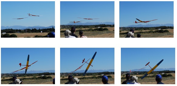 Esto si que es un problema … que dos modelos se encuentren en el mismo punto, y aunque el resultado de esta secuencia, además del susto, sólo fue la perdida de los puntos de toma, en el mismo vuelo, otro ‘abrazo’ acabó con daños en el borde de ataque de un Electra (lo hemos podido ver en la foto del ‘resumen’ del MASTER de Javier Iglesias). La secuencia corresponde a los aviones de Manuel Martí (blanco y rojo) y Rafael Jiménez (colores variados).