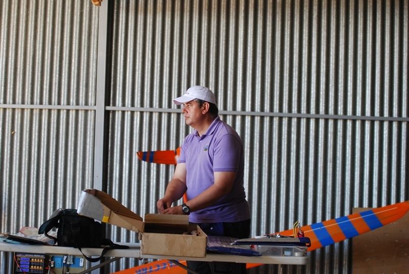 Todo empezaba con normalidad con las verificaciones de las criaturas, en las que nuestro amigo Luis Manuel González se subía a una silla para verificar los pesos, no por los pequeños del K6, sino por sus hermanos mayores del K4 y sus largos fuselajes. Como todos teníamos ganas de salir al campo de vuelo se hizo una cola interminable, que sólo se rompía en los escasos metros en los que el sol no daba tregua entre la salida del hangar y la codiciada sombra de la carpa que conducía hacia la verificación de los consumos. Bajo la supervisión de Javier Hernández para que todo fuera como un reloj suizo, se colocaron con ingenio dos mesas con el fin de medir a la mayor velocidad posible los consumos de las baterías y una vez controladas, se hacía el posterior cálculo en tiempo récord. Prácticamente mientras recogíamos nuestro avión de la mesa y sin darnos cuenta nos daban los tiempos con los codiciados segundos para nuestras trepadas. Bien por Javier.