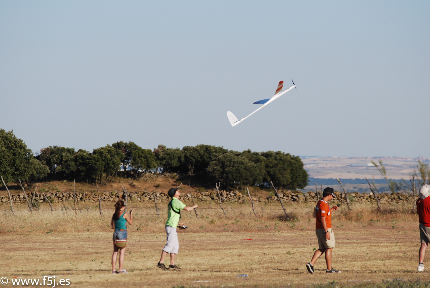 Aunque no sea la fórmula ‘fetén’ de la F5J y la FAI se haya desentendido de ella, es una delicia –y que me perdonen quienes no opinen lo mismo- prescindir de un cacharro que interfiere entre el regulador y el receptor; yo al menos vuelo más tranquilo sabiendo que hay una cosa menos en el avión que puede fallar (y que me ha fallado, precisamente –también- en este Master). Me gusta el factor de estudio que necesita para optimizar el rendimiento del conjunto motor, reductora, palas, batería en combinación con el peso del modelo. Me fascina maquinar la estrategia de vuelo para cada manga: ¿hacia dónde salgo?, ¿por dónde es mejor desplazarse? Y cuando has agotado la búsqueda de térmicas, aprovechar la fuerza del viento para subir haciendo giros con velocidad, subiendo escalones giro a giro y oyendo silbar el velero al girar raudo y veloz. Y si a tu lado tienes a los mejores veleristas de España, es para no perdérselo y dar gracias a Dios por haber podido estar concursando aquí, hoy, en Valdemorillo.