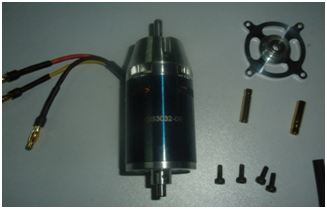 Pensé en un principio, que no iba a poder mover estas, porque según catalogo el motor consumía 104 A con cuatro elementos, pero la verdad es que las pruebas realizadas me dio un consumo de 87 A en bancada, lo que me permitía su uso sin problemas de temperaturas en el motor batería y regulador. El motor viene preparado para poner un apoyo trasero, pieza que se vende en kit y que básicamente es una costilla de contrachapado y un soporte de aluminio que va roscado a la costilla y que aloja un cojinete de rodadura.