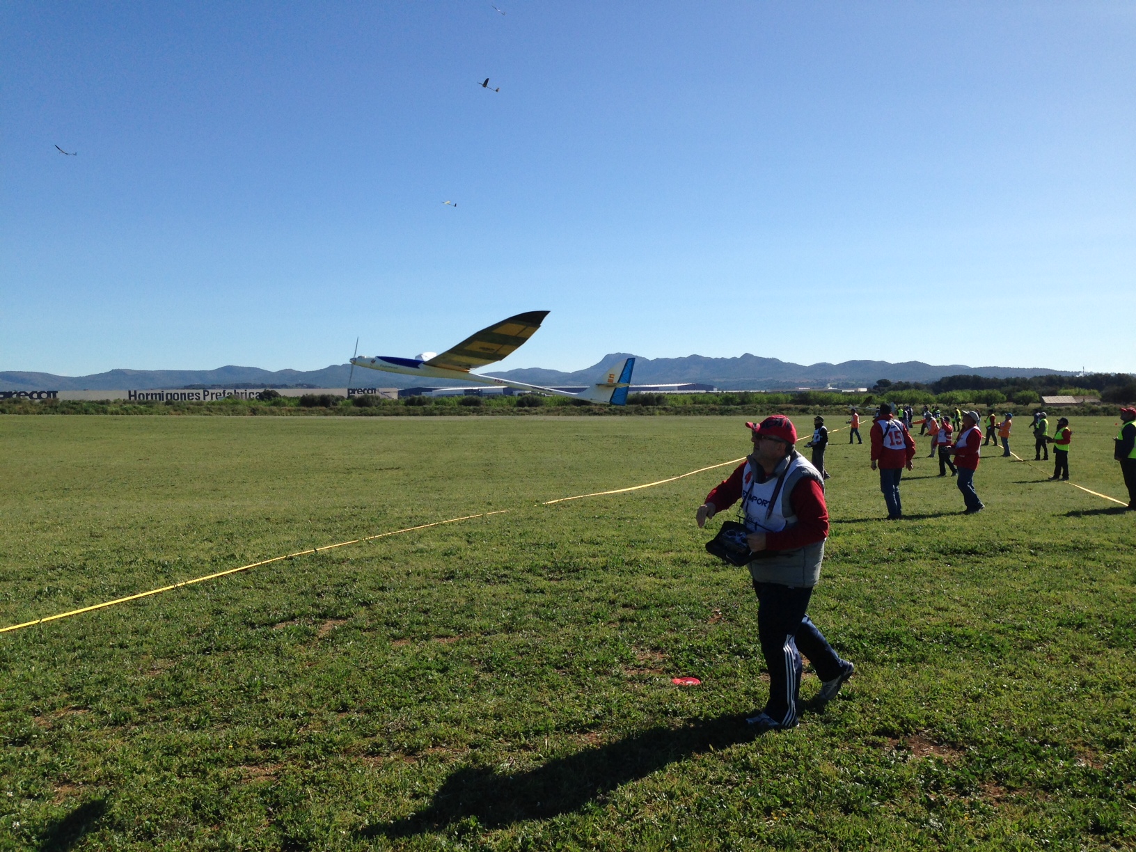 Al principio de la mañana, el tiempo era extraordinario, temperatura agradable y poco o nada de viento, aunque un poco raro, una dirección en el suelo y otro muy diferente al pasar los 50-60 metros. Todos los vuelos de la primera manga superaron los 6’ 30”. Algunos problemillas con las tomas, entre el desconocimiento del terreno y las ‘margaritas’ mas de uno lo dejó fuera de los puntos o casi. En general, veintinueve vuelos terminaron a menos de dos metros del centro y de ellos 13 a menos de uno.
