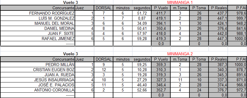 En la primera minimanga, Rafael, aún sin llegar a los seis minutos, consigue los mil pero a excepción de Sixte (973,9), el resto no consigue llegar a los 800 puntos FAI. Pedro pincharía con 663,1 despidiéndose del podio. Aunque el primer puesto parecía asegurado, en el segundo vuelo se decidiría el resto. Coronilla hace el mejor vuelo y se adjudica los 1000 y el segundo puesto.