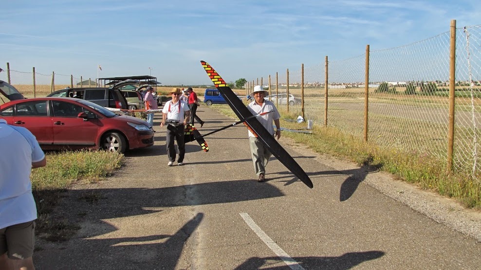 De modo que cuando los veleristas de K4 iban con sus modelos en la mano hacia los puntos de aterrizaje, lo que hasta entonces había sido calma y agradable solecito se empezó a transformar en viento intenso del NO con fuertes rachas, de modo que hubo que tirar de fondo de armario-maletero y ponerse algo de abrigo porque en manga corta se empezaba a estar desagradable. El viento trajo nubes que empezaron a danzar y mezclarse tapando el sol, que dejó de presidir la mañana de concurso, lo cual significaba complicaciones para los veleristas. Con la excusa del fresquete, Yolanda sacó el anorak acolchado, por si a alguno se le ocurría repetir con ella la experiencia del velerazo, que esta vez se lo llevó Pedro San José en un exceso de celo como cronometrador al no retirarse a tiempo de la trayectoria del velero convertido en misil al venir a favor de viento, desde aquí le mandamos un caluroso saludo con el deseo de que le haya desaparecido el dolor de la espinilla.