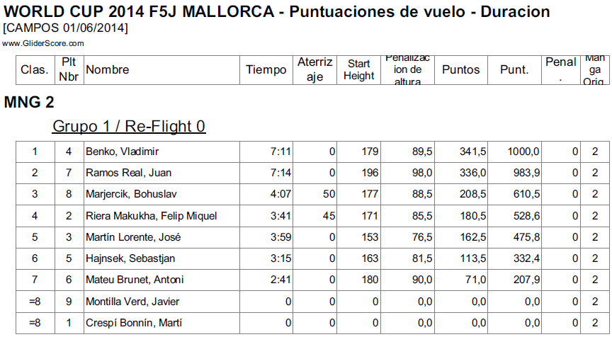 Bueno, parece que no, por lo menos en lo que respecta a altura de partida, aunque hubo cambios… no era fácil calcular la altura cuando al principio casi todos pretendían alejarse del punto de despegue y en última instancia subir, cuando se estaba bastante lejos, los cálculos no siempre eran acertados y no creo que el pensamiento fuera quedarse más bajo que en el vuelo anterior… y en cuanto a la toma… repite Felip y lo hace también en los puntos Bohuslav, con un perfecto ‘centro’. En los tiempos de vuelo, Vladimir y Ramos pasan de los siete minutos, casi ná…