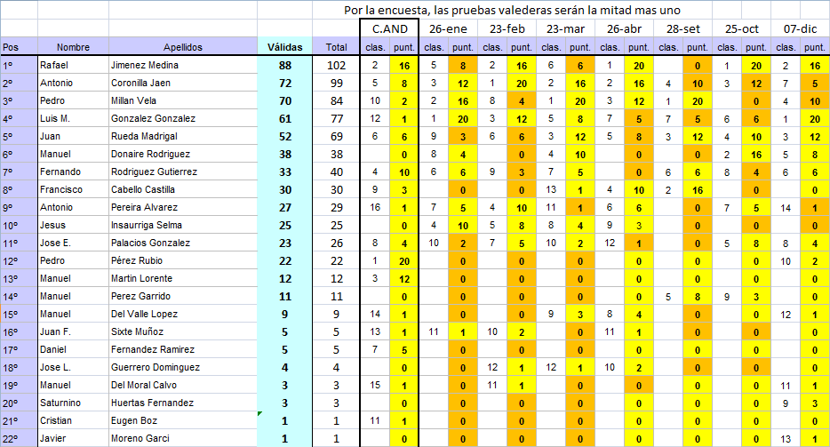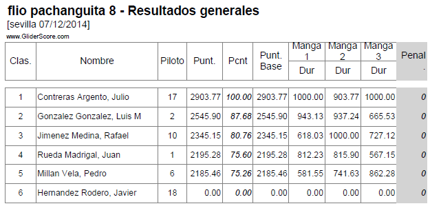 Todos se enfrentaban a todos, con la excepción de Coronilla y Rafa Jiménez que no lo harían en todo el concurso al igual que Fernando Rodríguez y Ángel Cristóbal , siendo además el máximo de coincidencias entre dos participantes ‘tres’. Desde aquí queremos agradecer a “GliderScore” su acierto con la aplicación realizada.