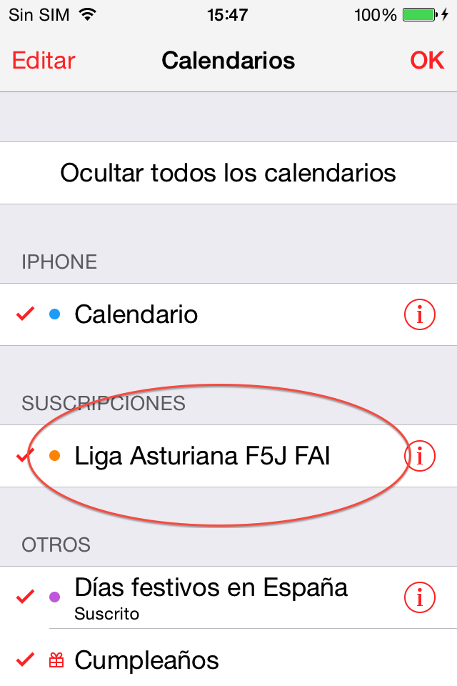 Y llegados a este punto, ya tenemos nuestro calendario de la liga que hayamos seleccionado, sincronizado con nuestro iPhone y podemos ver todas las citas de nuestra liga sin tener que hacer nada más.