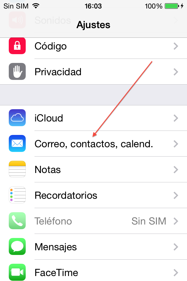 Una vez dentro nos desplazamos hasta ver la opción «Correo, Contactos, Calend.» y pinchamos sobre ella: