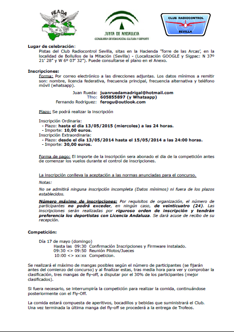 Ya estamos preparando el Campeonato de Andalucía y Open Nacional de F5J-FAI. Por el ancho de la pista no podemos comprometer a mas de 24 deportistas, de modo que ese será el número limite de inscritos, teniendo preferencia los deportistas con licencia andaluza.
