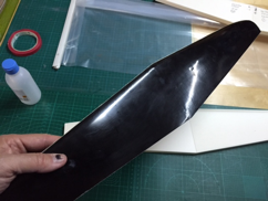 Después de las primeras emociones y los subidones vino el control de calidad: el acabado formal y el peso excelentes, la pintura la habíamos aplicado sobre el mylar una cara de negro (bien) la otra de blanco (fatal). Al tratar de lijar y pintar de blanco para mejorar el acabado se nos tronchó el estabilo, de modo que aprendimos que debíamos usar fibra de más grosor y las varillas de refuerzo tenían que llegar de extremo a extremo del estabilizador. Aunque es doloroso este tipo de chascos aportan unas lecciones insuperables e inolvidables, así el siguiente estabilo que hicimos, que es el que monta el primer Supra-MAD en vuelo, salió perfecto.