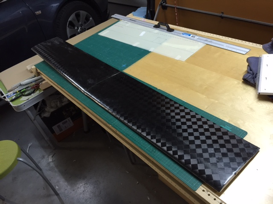 Lo que resultó más sencillo de lo que pensábamos fue la piel de recubrimiento de las alas, con una cuchilla redonda sobre una superficie de goma, los cortes a 45º del tejido fue coser y cantar, de modo que ni siquiera es fácil encontrar las líneas de solapamiento en los sitios donde no llegaba a cubrir la tela. Bolsa de vacío, pintura al mínimo con dos sencillas franjas blancas por debajo ya que es algo en lo que nos queda muuucho que progresar, y compresor de nevera reciclado con jeringa y muelle trabajando como campeones, terminada la sesión de presión facilísima la salida de la bolsa de vacío y directamente para el horno de curado. De este proceso pienso que la idea más importante que sacamos es el valor que tienen las camas de corte, que se vuelven tan importantes como el propio núcleo para un buen resultado en el proceso de vacío, momento en el que piensas el acierto que fue encargárselas a José Enrique Palacios en vez de hacer los cortes nosotros.