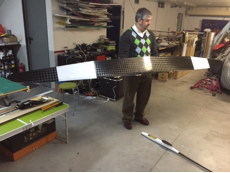 Con eso de fabricar el horno con las planchas de los conductos de aire a las que se les da la vuelta, el resultado se parece al sarcófago de Drácula pero en pequeño y con ruedas. Tanto espacio hay que da para hacer dos pisos y duplicar el rendimiento del horno, más adelante contaremos las modificaciones técnicas que le hemos añadido, pero la primera ala salió del horno sin grandes sofisticaciones. Y cuando parecía que aquello no se iba a acabar nunca… ¡voilà! Un espectacular ala de Supra-MAD en tres tramos de brillante negro-carbono con acabado a espejo, salvo una pequeña zona donde no pusimos la suficiente cera y que no queda a espejo (otra lección aprendida), el resultado es es-pec-ta-cu-lar y esta vez me quedo corto.