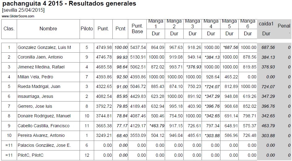 De nuevo la ‘movida’ clasificación se revoluciona, si acabada la tercera Pedro, Coronilla, Luis, Jesús, Juan… era el orden, en la cuarta quedó Pedro, Luis, Coronilla, Rafa, Juan… y acabada la quinta Pedro, Coronilla, Rafa, Luis, Jesús… y todo esto sin saberlo a ciencia cierta los participantes. No contamos, aún, con ese maravilloso GliderLink desarrollado por Sergio Martínez y las puntuaciones no se hacen ni siquiera en el campo, sino una vez en casa y por el ‘afortunado’ de turno, aunque ya repite en varias ocasiones Fernando.