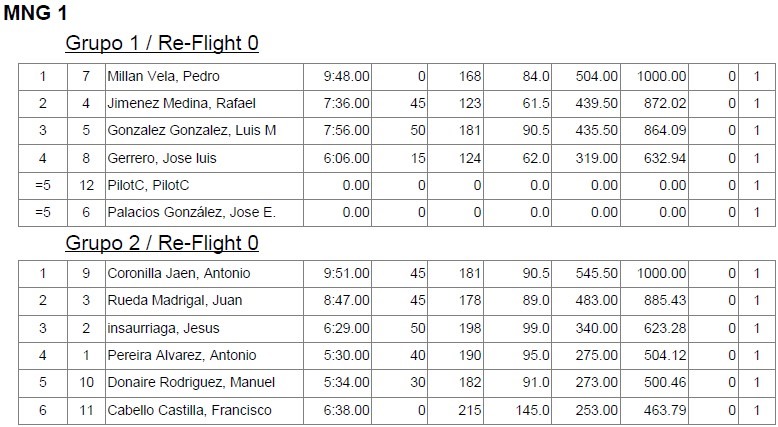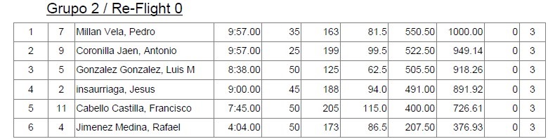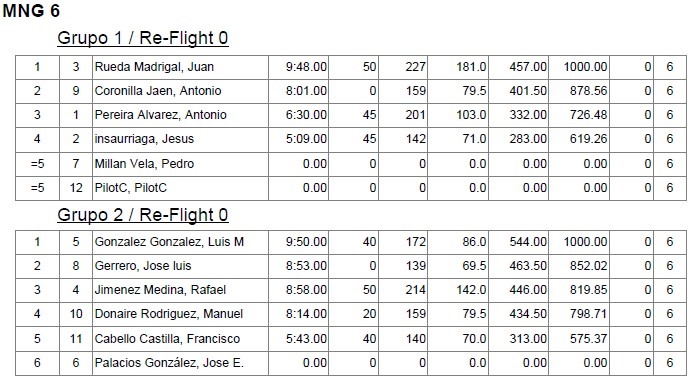 Para el sexto y último vuelo, en el primer grupo Juan se asegura la altura y se hace con el record de la prueba llegando a los 227m pero los aprovecha y consigue los mil de su grupo. En el opuesto Rafa con 123 y José Luis con 124m se harían con los mínimos y José Luis no lo haría por ‘arriesgar’ sino por ‘necesidad’ ya que está padeciendo un proceso penoso con la vista y aún así no veas como se defiende, habría sido el que menos metros acumulados subiría en todo el concurso si el último vuelo de Pedro hubiera sido válido. En el segundo grupo sería Luis el que se anotaría los 1000. Tanto en el grupo primero como en el segundo, las diferencias que se dieron, que aún no siendo grandes, removieron de nuevo la clasificación, en este caso ya final.