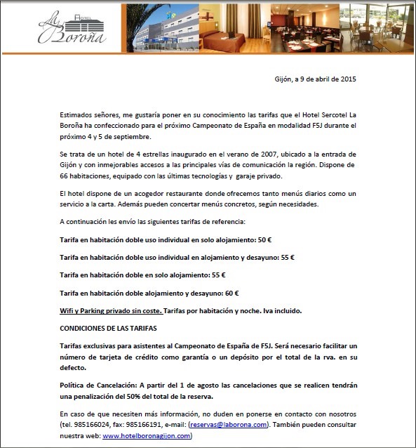 También nos adelanta que en el mismo Hotel (Hotel La Boroña) con el que se consiguió oferta en años anteriores vuelven a ofrecernos precios especiales para los asistentes al citado Campeonato de España