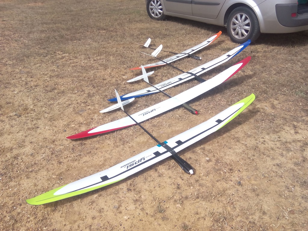 El tiempo nos acompañó durante toda la mañana; casi totalmente cubierto por nubes altas, con una temperatura agradable, mas cercana al calor que al frio y poco aire, el día fue un estupendo campo de pruebas para los modelos, y sus pilotos. Sólo un ‘palitos’ competiría en esta ocasión, el de José Enrique Palacios, que pese a disponer de los elementos para su nuevo modelo, aún no le ha metido mano. El equipo granadino y Coronilla competirían con un diseño de Rafa, su JOTA6, modelo de porex enchapado en fibra y con un peso espectacular; bueno Donaire usó un avión no completamente “de Rafa”, ya que era una simbiosis entre un lanzado a mano y el JOTA. Sixte, Rueda y Luis participaban con modelos ‘daidalos’, de ypsi, aunque cada uno de una con diferentes envergadura, Sixte de 2300, Rueda de 2300 y Luis de 2000 mm, en la foto vemos un cuarto modelo, el de repuesto de Rueda Sixte