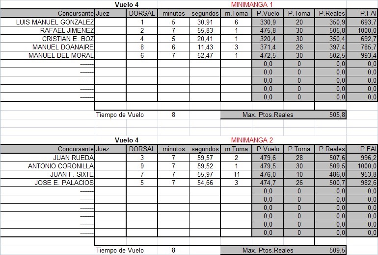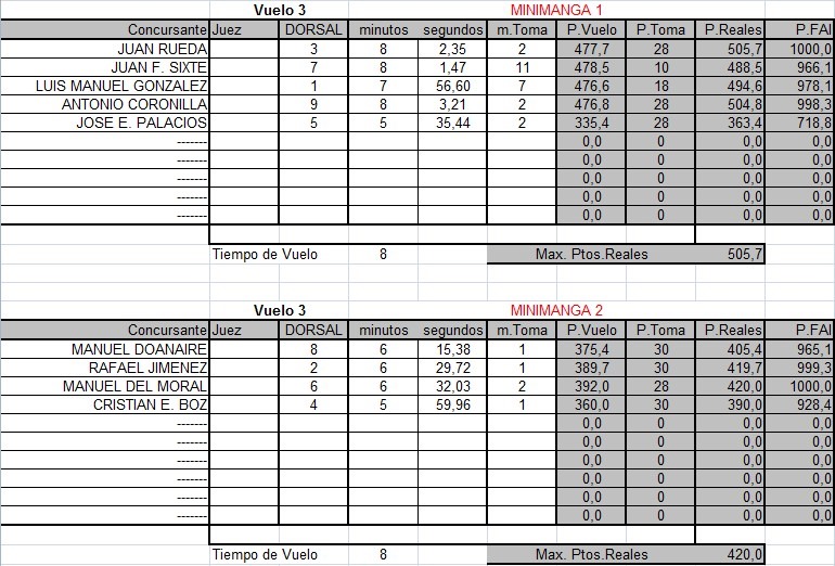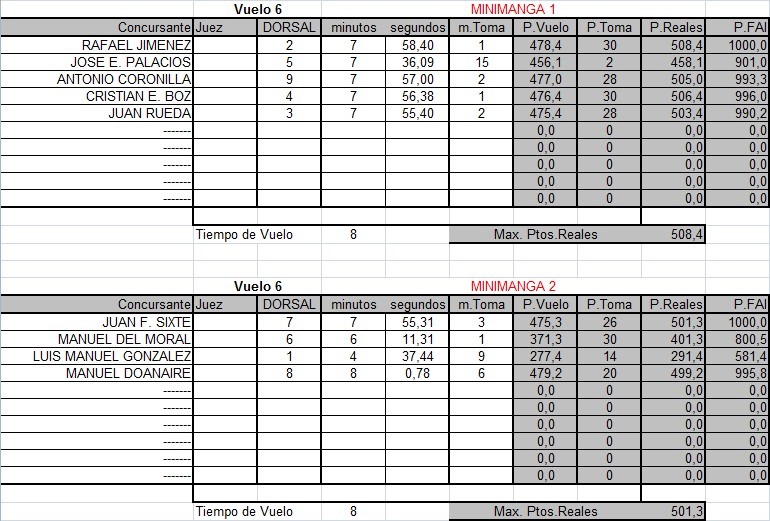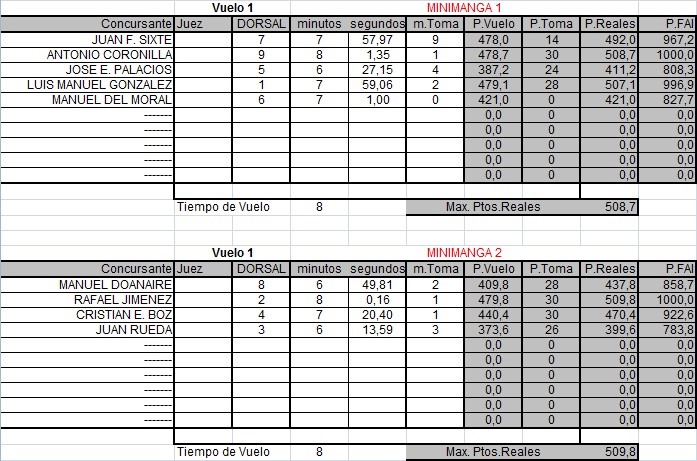 La segunda minimanga sería muy igualada, y hasta Palacios con su palito, se acerca a los ocho minutos y Sixte no culmina su vuelo al tener una toma regular (tirando a mal, jejeje). Y hablando de tomas, éstas han perdido un poco de la poca importancia que ya tenían en esta especialidad, ha pasado a representar (en el máximo posible) el 6,25% cuando antes representaba el 7,15% y aún representa mucho menos que en la prueba FAI (8,33%)