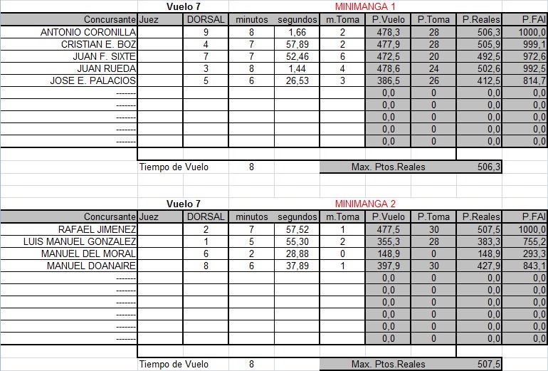 Y llega el séptimo y último vuelo … ¿quién hizo los deberes correctamente?, ¿ha cambiado algo la especialidad?; Coronilla, Cristian, Sixte, Rueda y Palacios componen la primera minimanga y es Coronilla el que se lleva los 1000 seguido de Cristian a sólo nueve décimas (999,1). Y el último 1000 del concurso se lo disputan Rafa, Luis, Del Moral y Donaire, anotándoselo, sin lugar a dudas Rafa