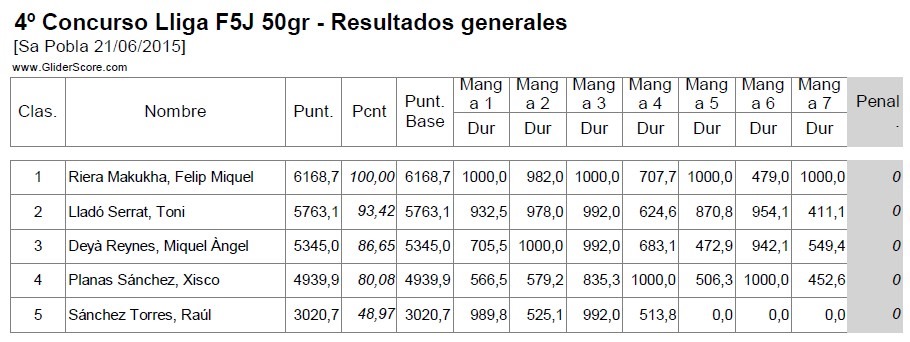 Sólo dos personas consiguen aguantar más de 9 minutos en el aire, siendo Luis Tejero con su Kappa35 el que consigue el 1000 de esta manga. El resto de resultados son como una cascada de puntuaciones que baja hasta los 3 minutos de Juan Koers que se defiende como puede y con mucho mérito con su pequeño avión.