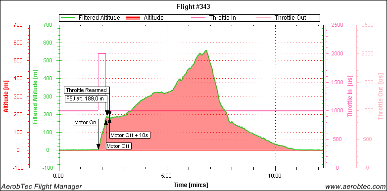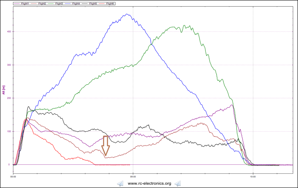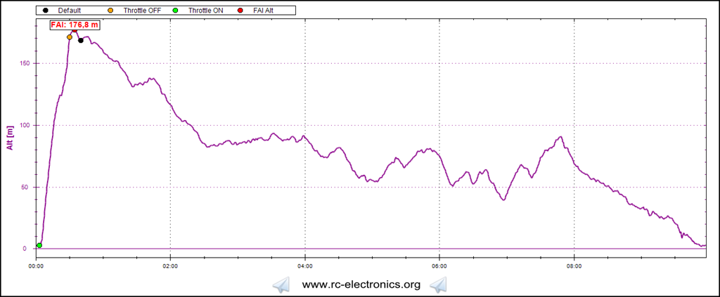 Al parecer perdió el avión de vista y en el intento de recuperar el control accionaría la palanca de motor instantáneamente ya que no refleja siquiera el arranque, pero lo suficiente para marcar su activación y … el correspondiente ‘chivatazo’ del altímetro. He sufrido el mismo percance (en un estornudo) y aunque no parece muy equitativo se han de mantener los criterios sobre el uso del FW que permite el rearranque en aquellas pruebas en las que así se autoriza. José Enrique en uno de sus vuelos también sufrió un movimiento instantáneo en las palas de su motor, pero debió ser como resultado de alguna ‘interferencia’ ya que, además de leer correctamente la altura de partida, no consta en el log de los vuelos ninguna constancia de esa activación, por lo que no ha lugar a la penalización.