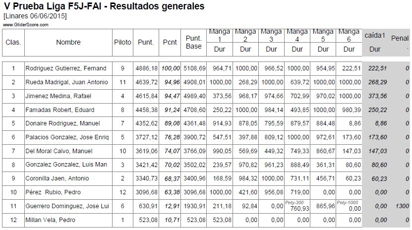 Espero nos veamos en futuras ediciones de pruebas de esta liga F5J-FAI y en la mas novedosa de Veleros Remolcados, o en la promoción del aeromodelismo en la que tanto empeño pone el Excmo. Ayuntamiento de Linares y el Club Aeromodelismo Linares con la escuela de aeromodelismo y pensando en la posibilidad de carreras indoor en el pabellón cubierto con aviones de ‘corcho’, prueba fácil de organizar y muy llamativa para el espectador.