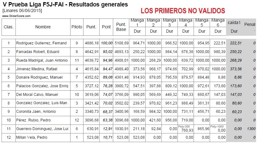 Estas condiciones atmosféricas han provocado que hubiera en casi todas las mangas muchísima diferencia de tiempo y de puntos entre el primero o los primeros y el resto, porque no hay color entre encontrar la térmica y no encontrarla, porque el viento era inmisericorde. Y la clave ha estado en tener la suerte de encontrar las térmicas en varias mangas seguidas y la pericia de saber volarlas, porque como te salieras te estaba esperando una descendencia.
