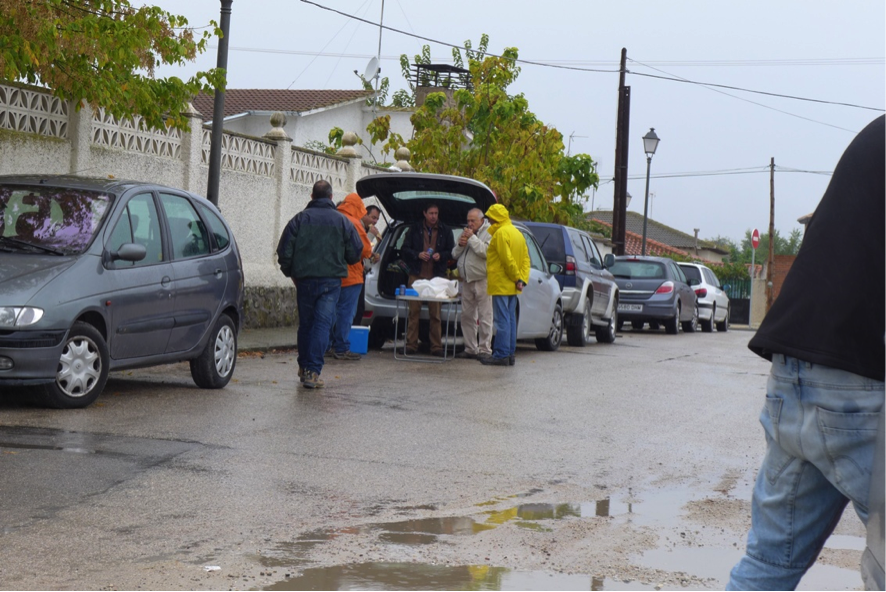 ¿Y los bocatas? Podría preguntar un avezado lector, pues haberlos los hubo, pero para evitar en lo posible que nos lloviera los dejamos para el final del concurso y al finalizar el mismo por la persistencia de la lluvia Enrique Cobo –volviendo a acertar en las decisiones como Director de la prueba- optó por invitarnos a abandonar el campo antes de que el camino se pusiese peligroso por la lluvia y quedar en la zona de asfalto cercana a la carretera y allí montamos el campamento gitano que eso era lo que parecía aquél grupo de gente mojada bajos sus chubasqueros con el pelito húmedo pegado a la frente, la nevera de playa, la mesa plegable y zampando unos enormes bocadillos, el que no se lo pasa bien es porque no quiere.